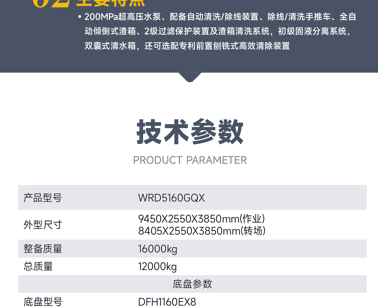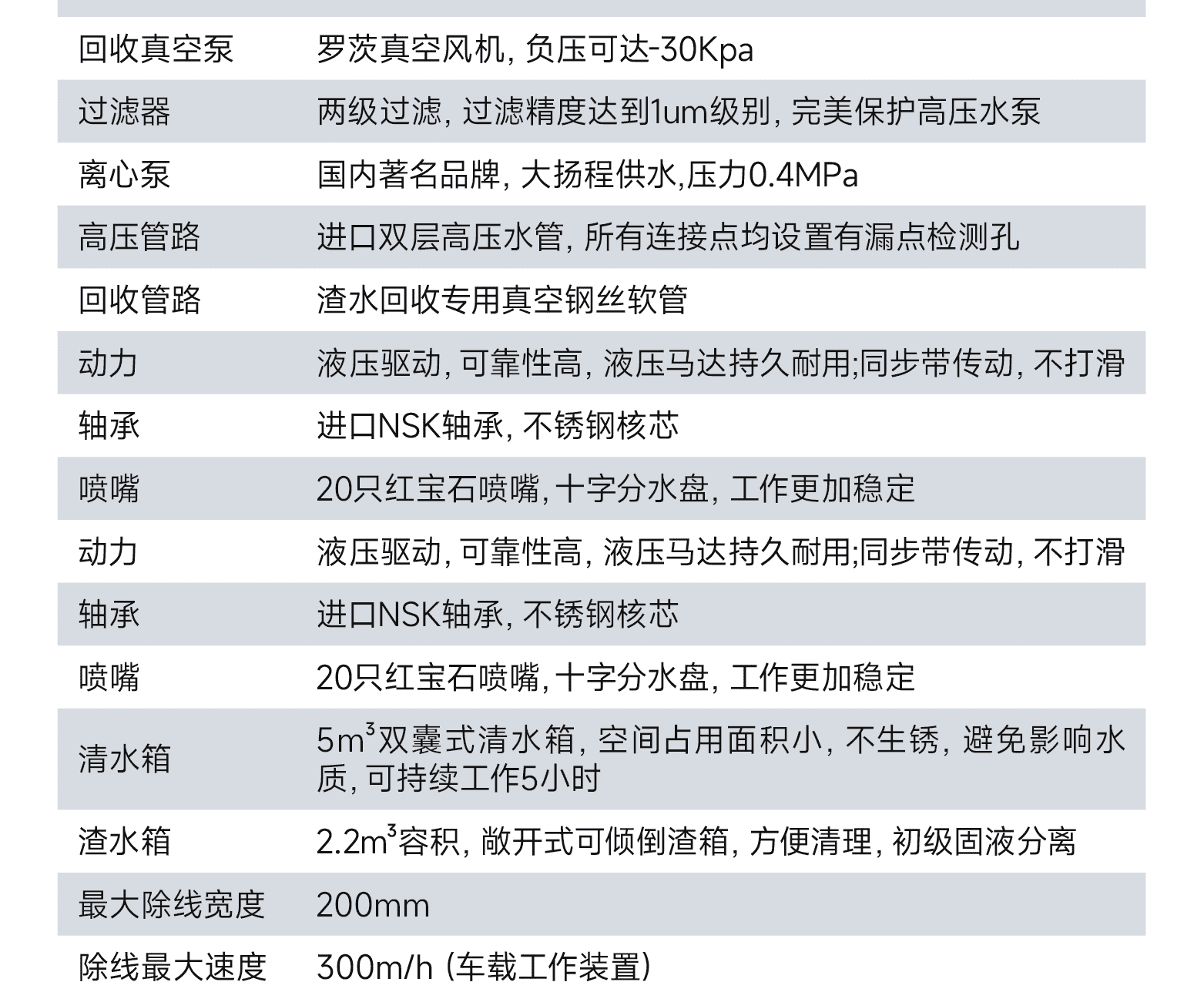 主要特點:200MPa超高壓水泵、配備自動清洗/除線裝置、除線/清洗手推車、全自動傾倒式渣箱、2級過濾保護裝置及渣箱清洗系統,初級固液分離系統,雙囊式清水箱,