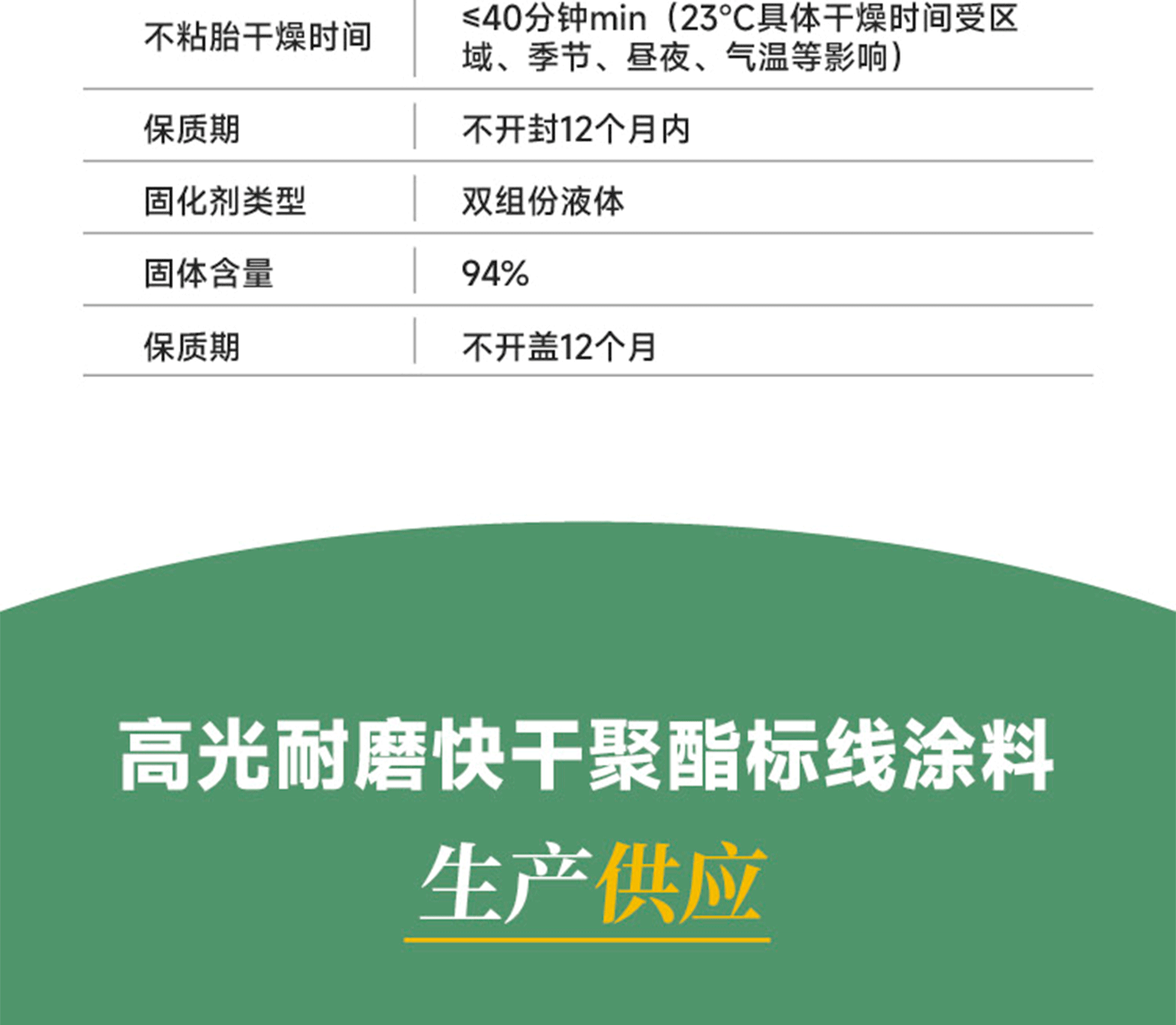 柔性聚酯樹脂、復配顏填料及多種功能性助劑,經特殊工藝制成的綠色耐磨反光標線材料。高保光保色性,耐候性能強,高韌性耐磨抗開裂,無味環保,耐-25℃低溫和60℃高溫