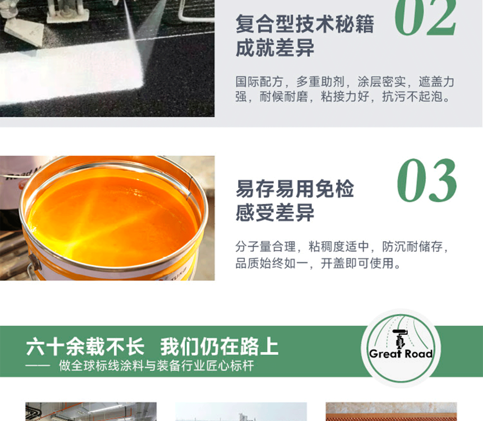 環保型高光耐磨聚酯標線涂料,由柔性聚酯樹脂、復配顏填料及多種功能性助劑,經特殊工藝制成。該涂料具有優異的黏接性、耐候性、耐磨性、結構穩定性及施工便捷性。