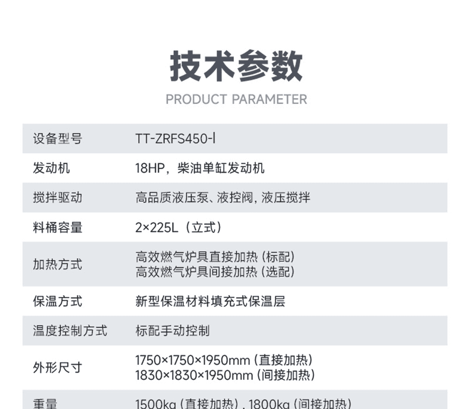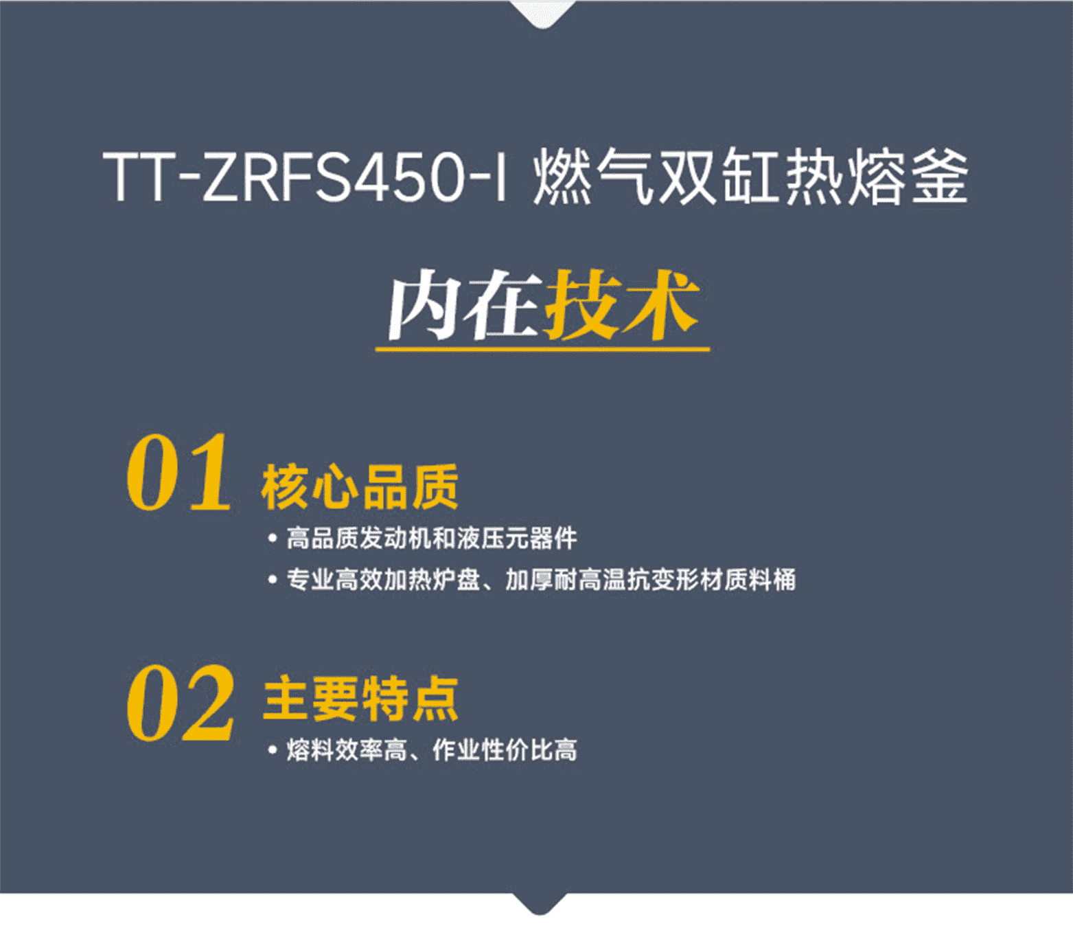 核心品質:高品質發動機和液壓元器件、專業高效加熱爐盤、加厚耐高溫抗變形材質料桶。主要特點:熔料效率高、作業性價比高