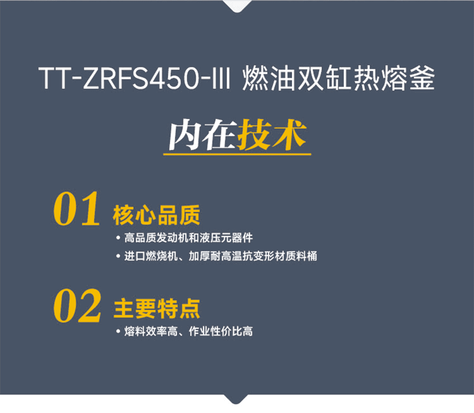 核心品質:高品質發動機和液壓元器件、進口燃燒機、加厚耐高溫抗變形材質料桶。主要特點:熔料效率高、作業性價比高