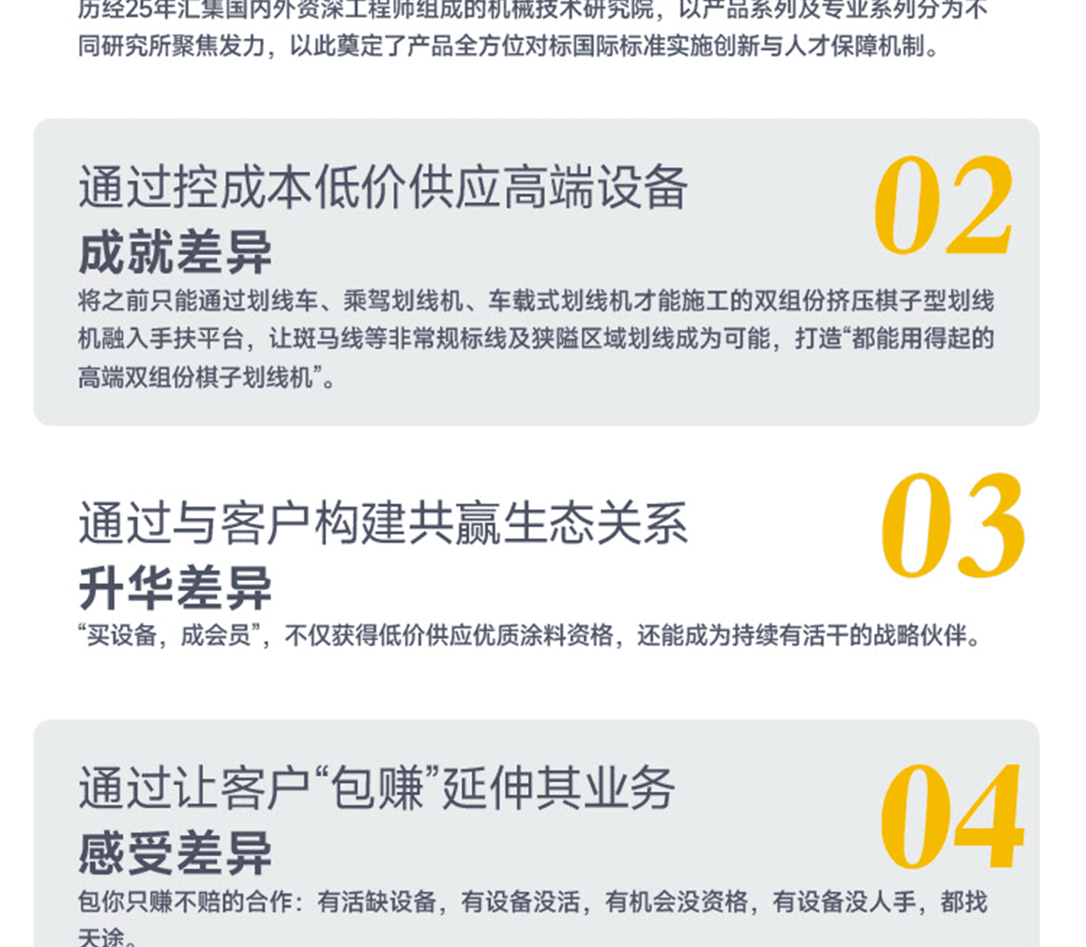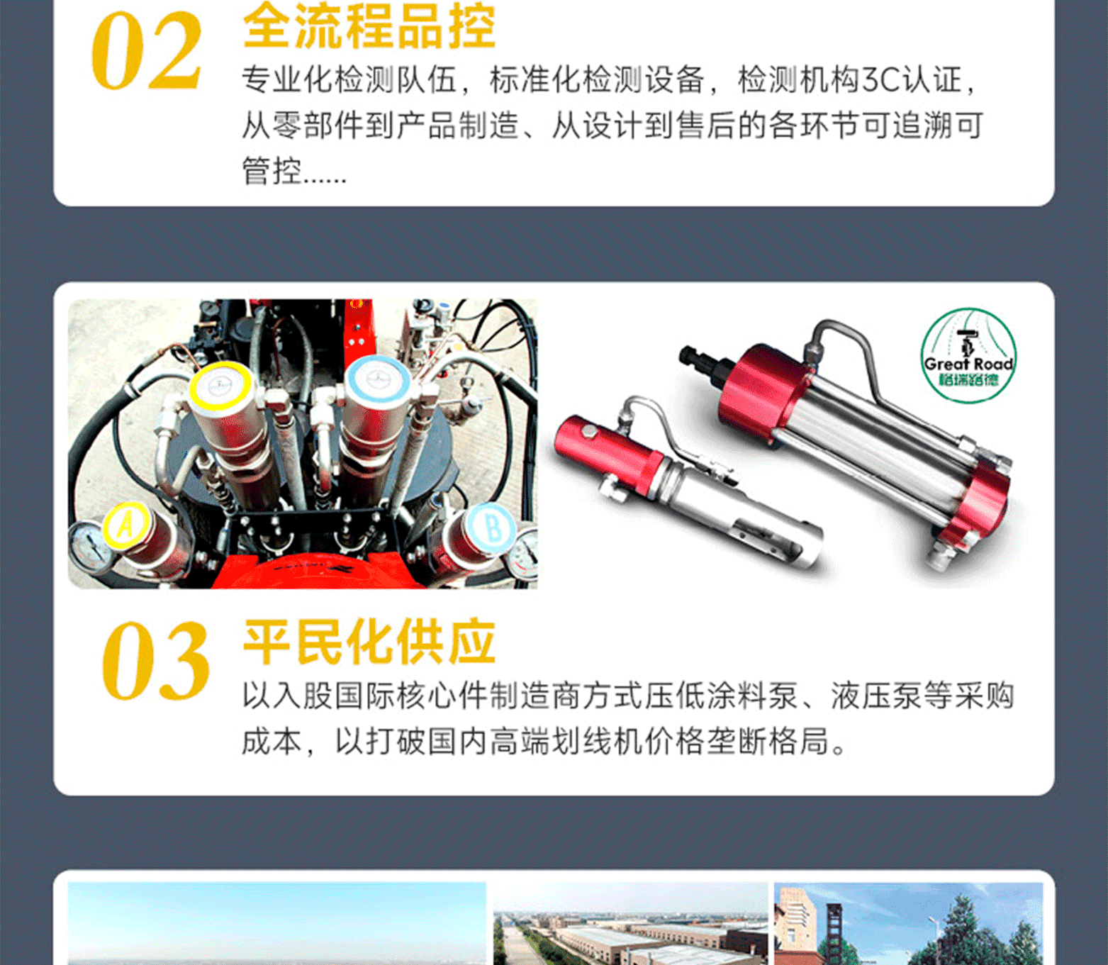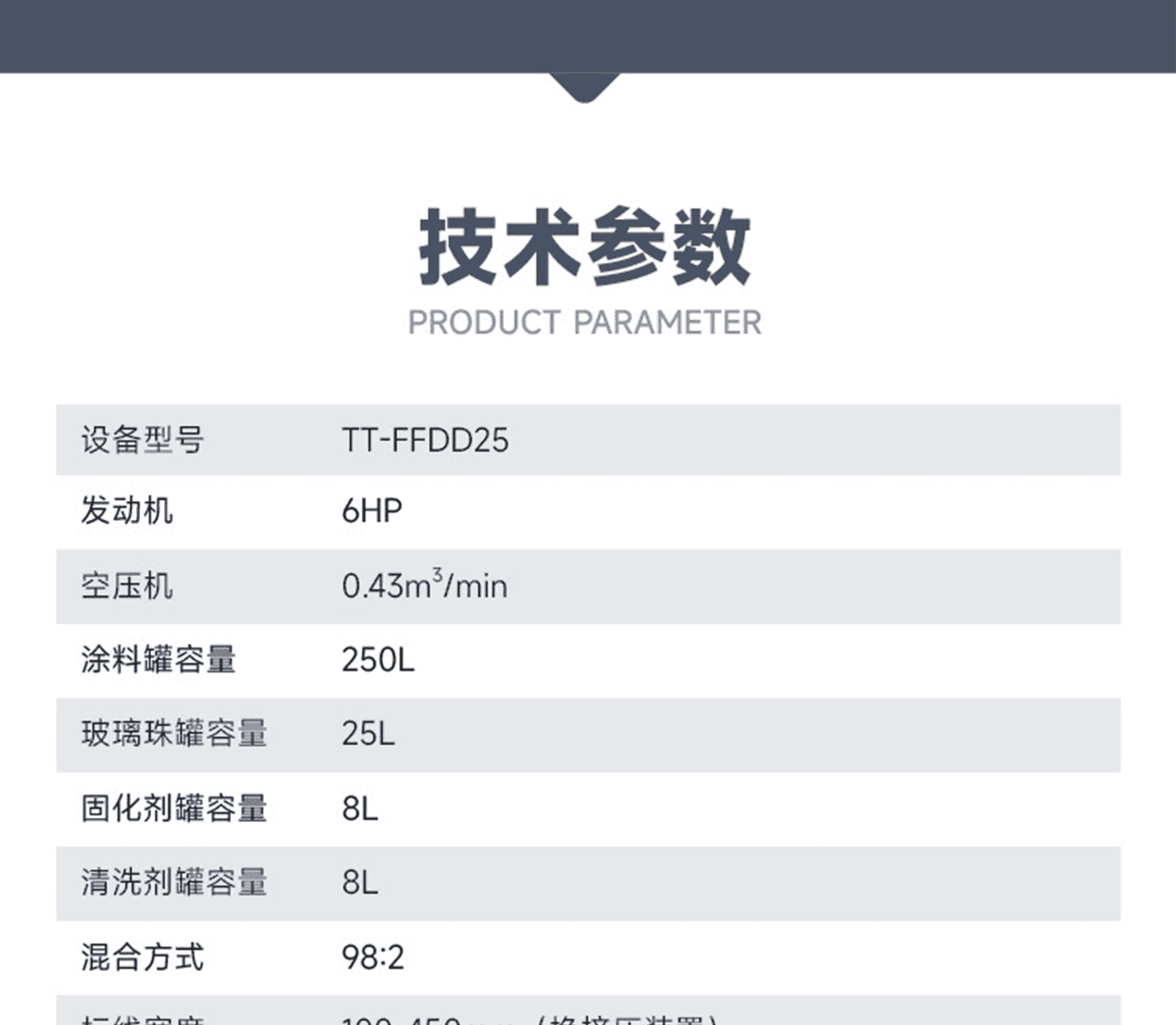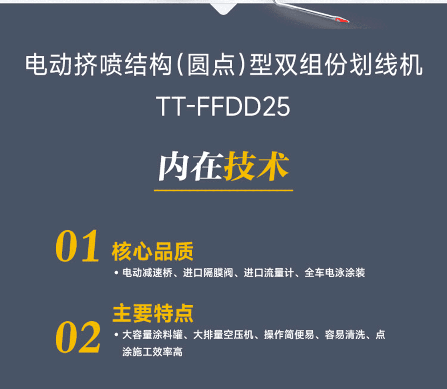 核心品質:電動減速橋、進口隔膜閥、進口流量計、全車電泳涂裝。主要特點:大容量涂料罐、大排量空壓機、操作簡便易、容易清洗、點涂施工效率高