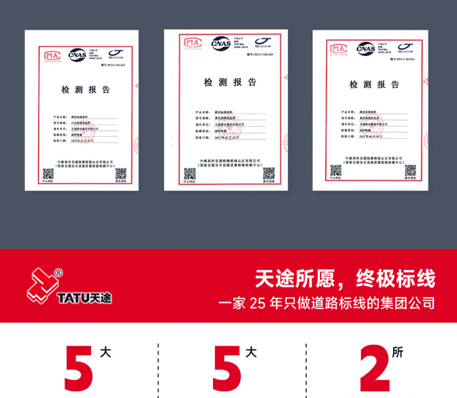 涂料特點:結構密實不開裂,抗壓耐磨不黃變、卓越的識認性、對路面玻璃珠粘接力強。標線特點:表面平滑顏色鮮艷;密實耐磨反光好;不龜裂、不黃變,質量免檢;標線壽命長,是常規熱熔標線的1.6倍。