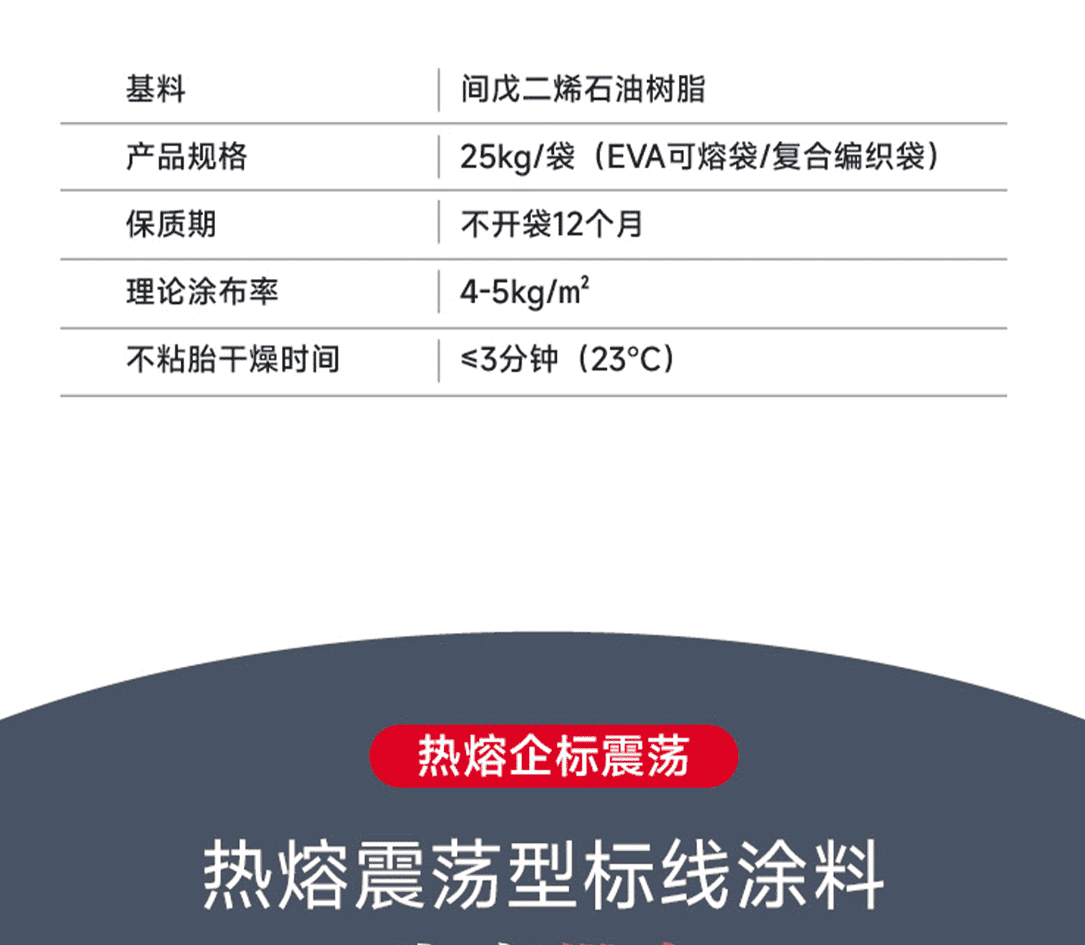 涂料特點:結構合理、混合均勻、質量一致性高 / 玻璃珠含量少 / 用途廣泛,使用方便。標線特點:表面平滑顏色鮮艷;密實耐磨反光好;不龜裂、不黃變,質量免檢;