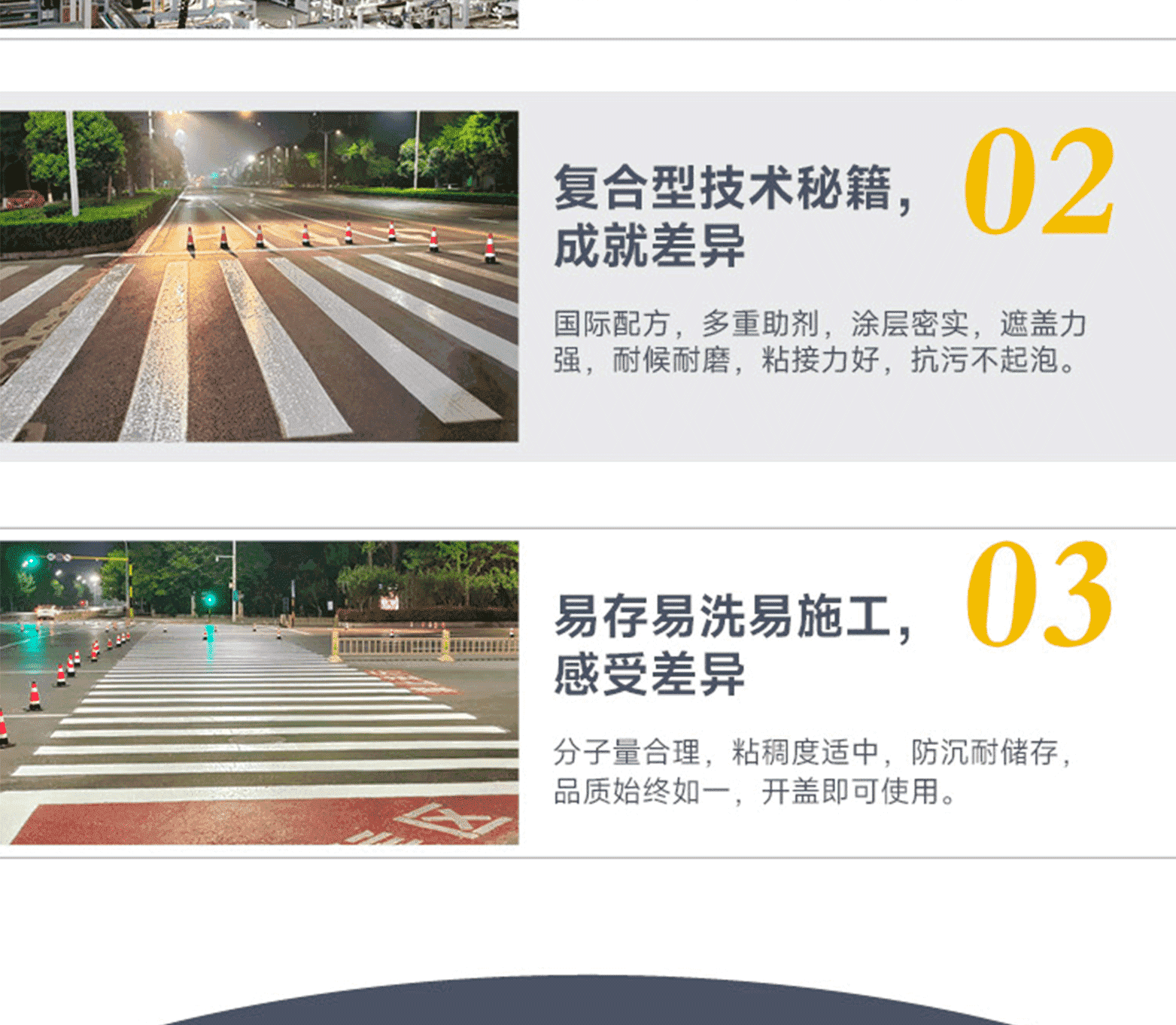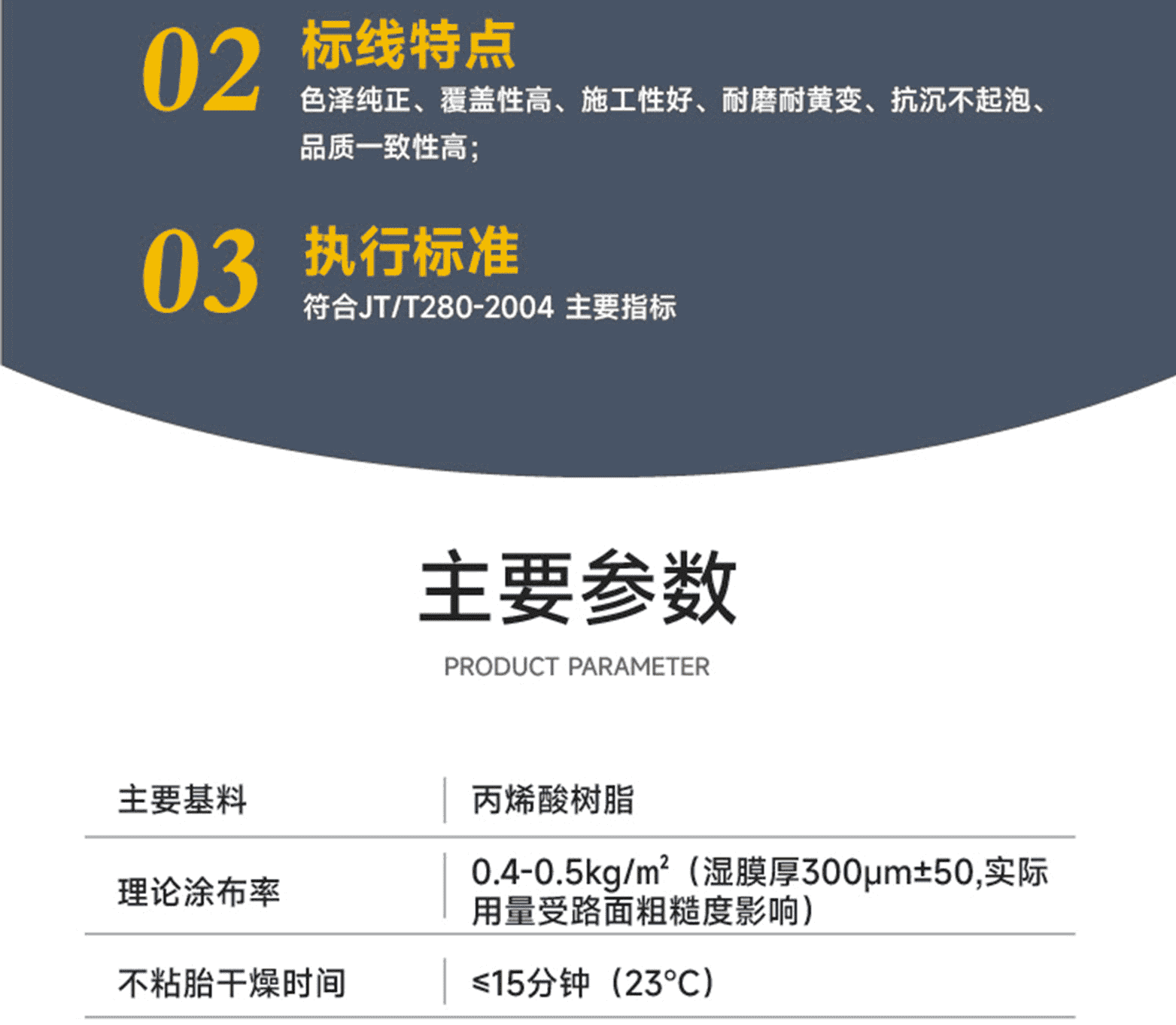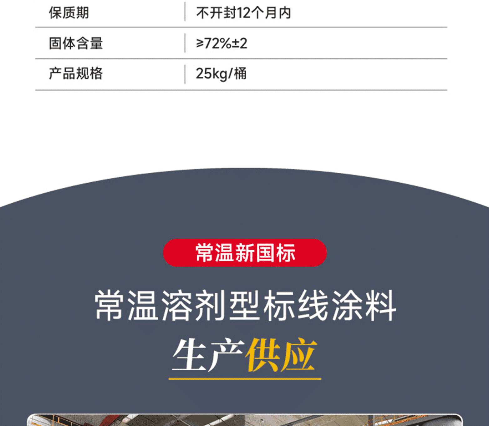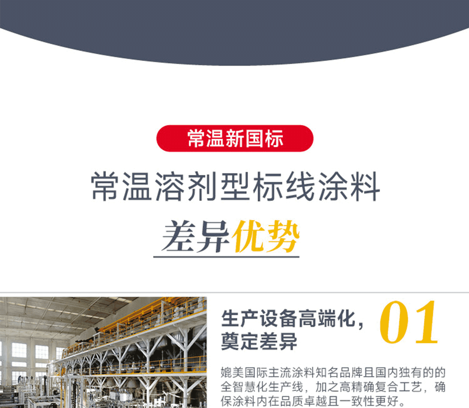 標線品質:進口基料、金紅石鈦白/有機鉻黃顏料、多重優質助劑、復合工藝、標準化檢測;標線特點:色澤純正、覆蓋性高、施工性好、耐磨耐黃變、抗沉不起泡、品質一致性高;