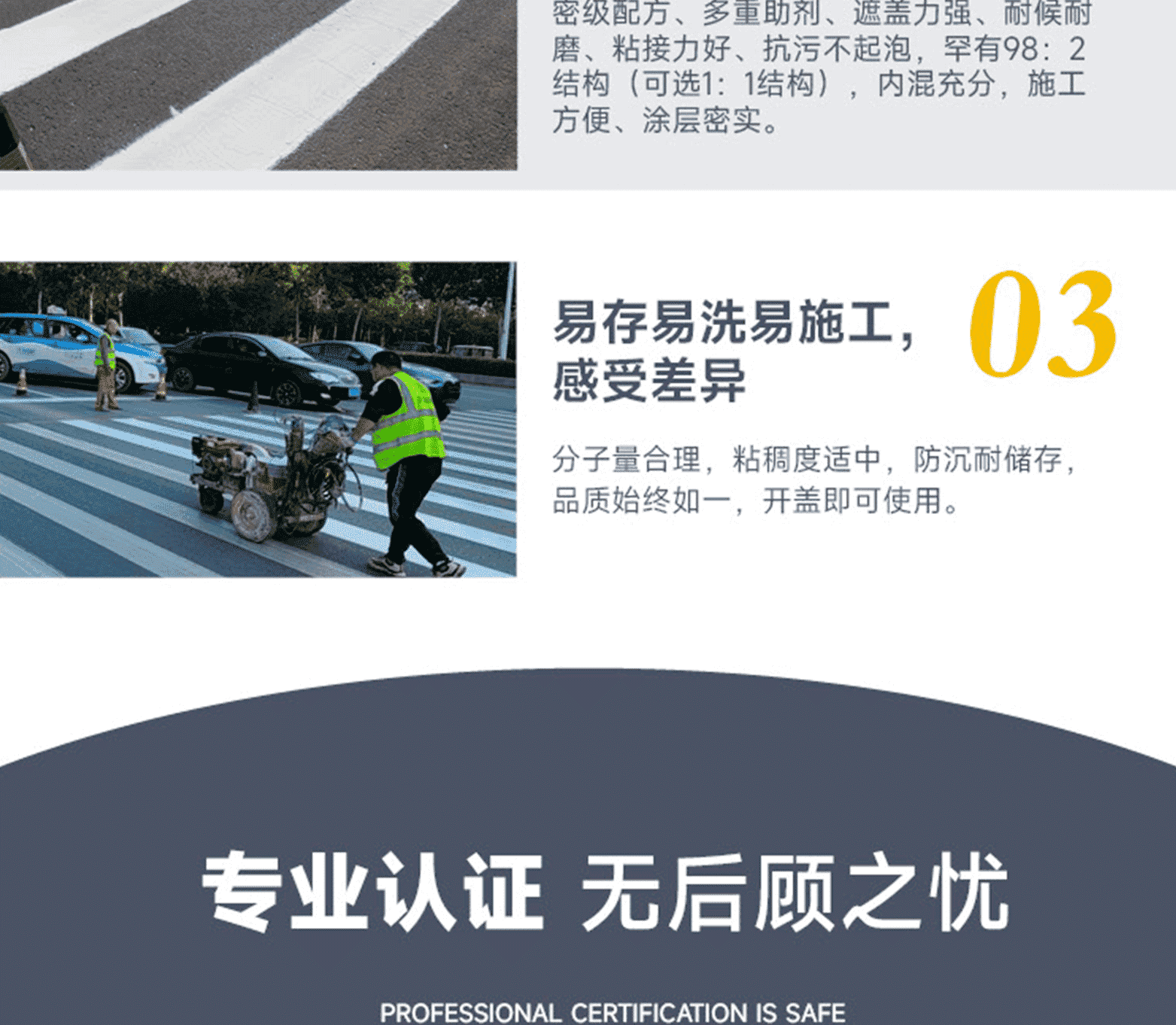 ?專家測(cè)評(píng):標(biāo)線品質(zhì):進(jìn)口基料、氯化鈦白/有機(jī)黃顏料、多重進(jìn)口助劑、復(fù)合工藝、標(biāo)準(zhǔn)化檢測(cè);標(biāo)線特點(diǎn):涂料細(xì)膩、抗污性強(qiáng)、覆蓋性高、耐磨耐候、施工性好、抗沉不起泡;